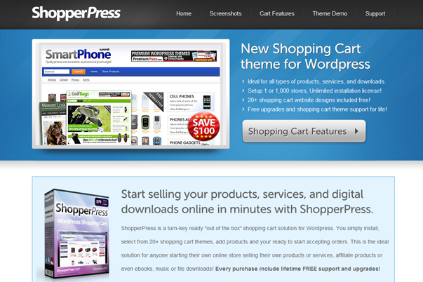 O ShopperPress é uma solução chave-na-mão para WordPress. Você apenas necessita de instalar o plugin, seleccionar de entre mais de 20 templates de e-commerce disponíveis, adicionar produtos e começar a vender. É uma solução bastante simples de usar e inclui integração com vários tipos de carteiras eletrônicas como o Paypal, Moneybookes e outras. Oferece também integração com anúncios do Google Adsense e estatísticas do Google Analytics.