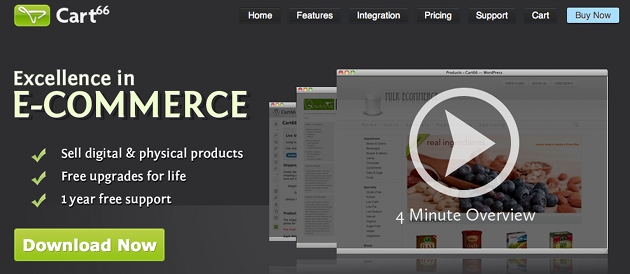 O plugin Cart66 é atualmente um dos melhores, senão o melhor, plugin wordpress para carrinho de compras e sites de e-commerce criados em cima da plataforma WordPress. Com o Cart66 você pode comercializar não só produtos digitais, como também produtos físicos e serviços. Além disso, o Cart66 inclui um sistema de membership que lhe permite cobrar pelo acesso a determinadas áreas ou conteúdos do seu site.