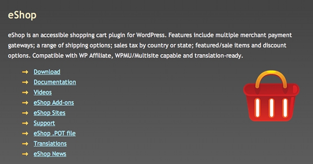 O plugin eShop é um plugin de carrinho de compras acessível para WordPress. De entre as opções que inclui, este plugin permite-lhe integrar vários sistemas de pagamento em simultâneo; várias opções de envios; taxas e impostos por país ou cidade; produtos em destaque e cupoms de desconto, entre outras.