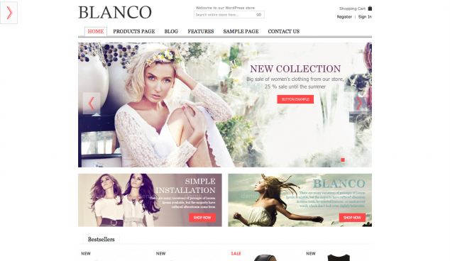 O tema Blanco para WordPress, é um tema dedicado ao E-Commerce, que pode ser facilmente adaptado a lojas de roupa ou qualquer outro tipo de negócio. O tema inclui um painel de administração fantástico, um slideshow na homepage, listagens de novos produtos, blocos de conteúdo e uma série de outras opções deliciosamente pensadas para fazer as suas vendas subirem. Este tema é provavelmente um dos mais poderosos e flexíveis temas de E-Commerce para WordPress disponíveis no mercado. O tem é compatível com lojas pesadas e que necessitem alocar milhares de produtos, várias línguas e moedas, etc. Você tem ainda disponível várias opções de gestão que lhe permitem alterar facilmente todas as cores e fundos do tema.