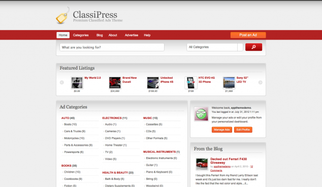O tema ClassiPress para WordPress é o tema de classificados mais popular e mais usado no mundo para WordPress. Este tema incrível oferece uma elevada variedade de opções e um integração sensacional com o core do WordPress, para que você possa construir o seu site online e vender os seus anúncios de classificados em poucos minutos. O tema inclui ainda páginas personalizadas para listagens, categorias, contatos e também um painel de usuário que lhe permite aprovar e desaprovar anúncios, gerenciar anúncios inseridos, etc. O tema vem também ele preparado com sistemas de pagamento, para que você possa cobrar pela publicação de anúncios no seu site de classificados.