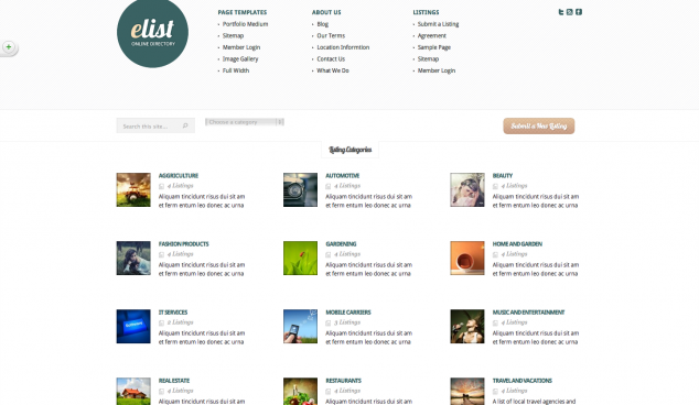 O tema eList para WordPress é um tema para diretório de conteúdo. O tema pode ser facilmente usado para diretórios de sites e blog, diretórios de fotografias e conteúdos, diretórios de imagens, etc. Ele permite aos visitantes submeterem conteúdos novos para o site, existindo também a possibilidade de cobrar aos usuários para a publicação de conteúdos em destaque. O tema inclui também um painel de controlo que lhe permite customizar todas as opções visuais e estruturais do tema, de acordo com as suas necessidades. O tema inclui ainda 6 cores diferentes, shortcodes e diversos templates de páginas.