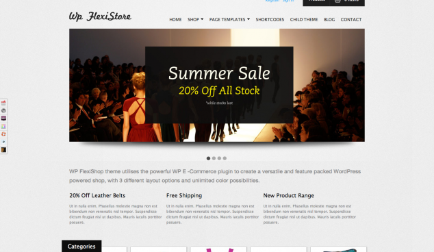 O tema FlexiShop para WordPress utiliza um plugin de E-Commerce integrado para criar uma loja online versátil e flexível, com 3 tipos de layouts diferentes e possibilidades de cores ilimitadas. Se desejar, poderá misturar conteúdos na homepage criando áreas de conteúdo organizado, e escolher entre duas áreas de rodapé diferentes, ou usar ambas! Este tema é extremamente versátil e você poderá estilizá-lo da forma que bem desejar para criar o seu negócio na internet de uma forma elegante e organizada. O tema inclui também painel administrativo para você gerenciar todos os aspectos de organização do seu negócio.